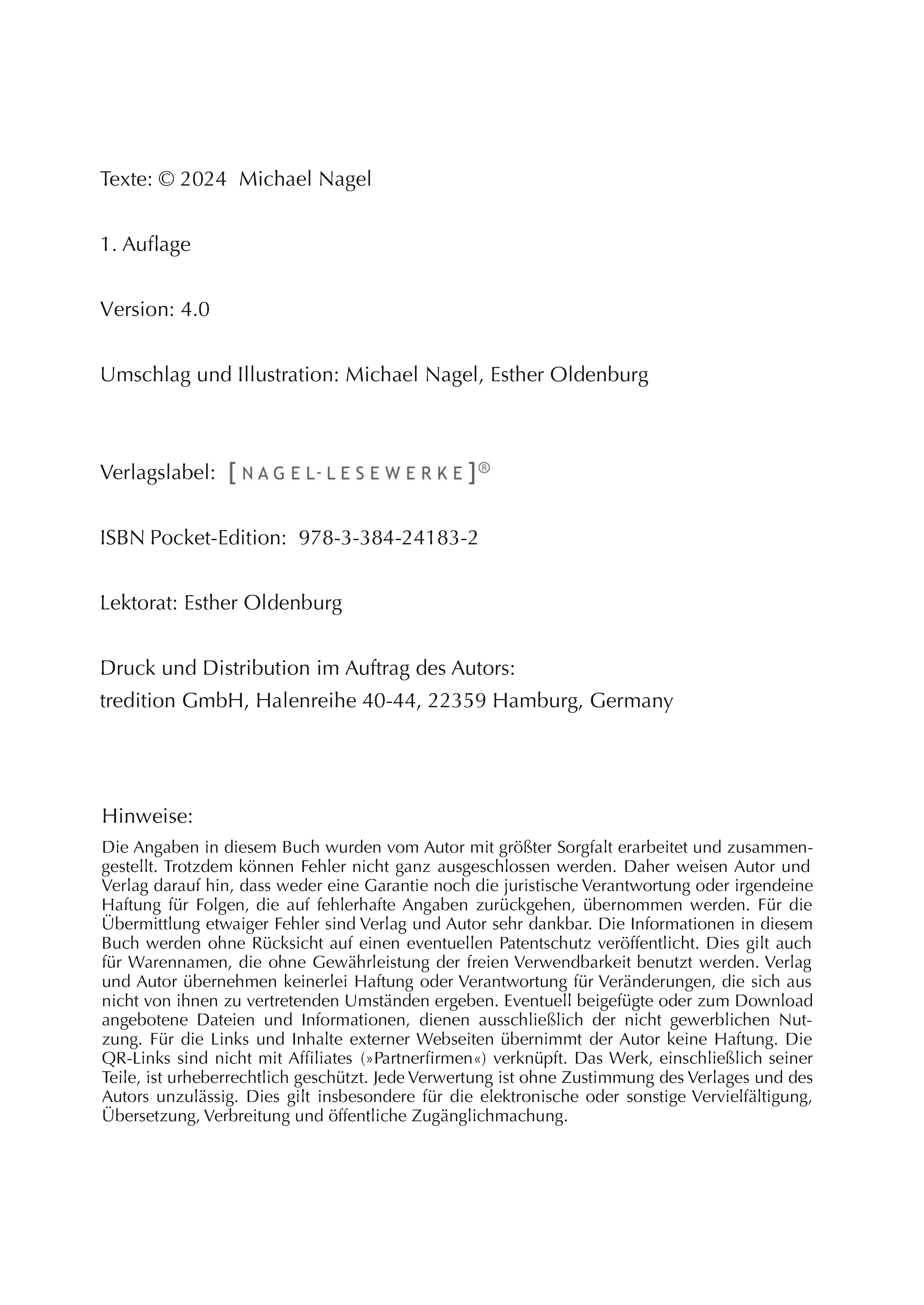 Der Vertrieb erfolgt über Self-Publishing (Verlag tredition), der Titel wird also nicht "auf Halde" produziert, sondern nur in der real angeforderten Stückzahl. Dieses zeitgemäße Verfahren spart wertvolle Ressourcen ein und ermöglicht es dem Autor außerdem, den Inhalt für seine Leser stets aktuell zu halten!
